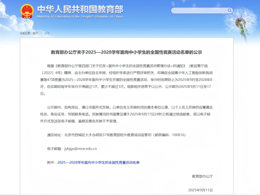 9月11日,教育部办公厅最新公示了《2025-2028学年面向中小学生的全国性竞赛活动名单》。对于高一、高二、高三来说,除了众所周知的数理化生信五大奥赛,还有哪些竞赛值得参加?哪些竞赛认可度更高?有哪些竞赛正在报名?一探究竟!