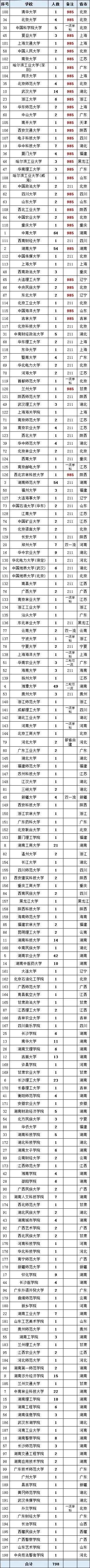 拟录取人数排名前9的都是省内高校:中南大学64人,湖南大学54人, 湖南师范大学54人, 湘潭大学49人, 湖南农业大学42人, 长沙理工大学23人, 中南林业科技大学22人, 湖南工商大学21人, 湖南涉外经济学院15人。