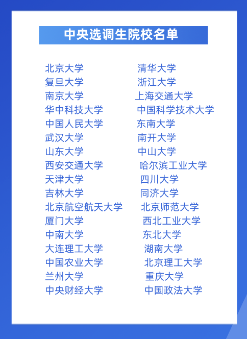需要提醒大家的是,有小伙伴反馈法大参与选调的应届生必须来自法学类专业、央财的应届生必须是财经金融类,而985高校则没有专业限制,这一点需要注意。