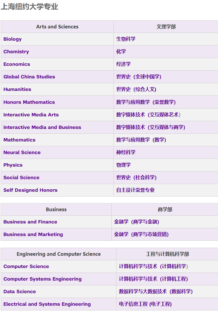 上海纽约大学实行通识教育核心课程的培养,设有19个本科专业及方向,提供多个跨学科的辅修专业课程。