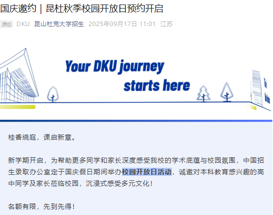 9月17日,昆山杜克大学正式宣布秋季校园开放日预约通道开启。作为中外合作办学领域的顶尖高校,昆杜开放日是了解国际化教育的绝佳窗口。对于正在规划孩子未来国际化道路的湖南家庭而言,这无疑是一个不容错过的机会。