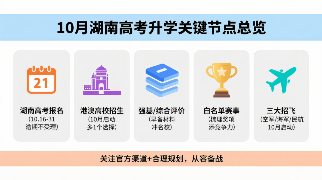 进入10月,高考复习逐步深入,各项招考工作也陆续展开。作为家长,及时了解信息、提前规划准备,是为孩子提供有效支持的基础。现将本月需关注的五项重点事项整理如下,希望能为您分忧解惑。