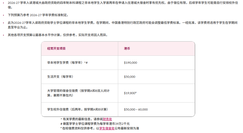 内地生学费为190000港币/学年,住宿费前两年为19800港币,后两年校外住宿50000-60000港币。