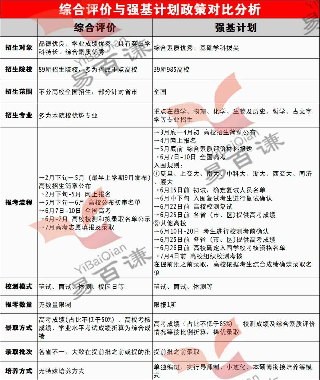 如果还心存担心,那今天给大家介绍两种有机会降分录取的主流升学路径,综合评价和强基计划。这两种升学模式,录取分数线相对较低,一定程度上可缓解高考压力;其次,招生院校层次广,普通本科、省属重点、211、985、清北等top高校都有,中等生也能覆盖到,给了普通考生低分考入名校的机会,想低分考入名校的考生和家长可以重点关注下这两种升学路径,小易老师针对综合评价和强基计划的招生政策也做了对比分析,供大家进行参考,一起来看看吧~