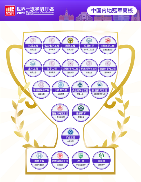 21个学科上位居世界第一,仅比美国少6个。2025年软科世界一流学科排名新增了人工智能、机器人科学与工程两个学科,排名学科数达到57个,覆盖理学、工学、生命科学、医学和社会科学五大领域。