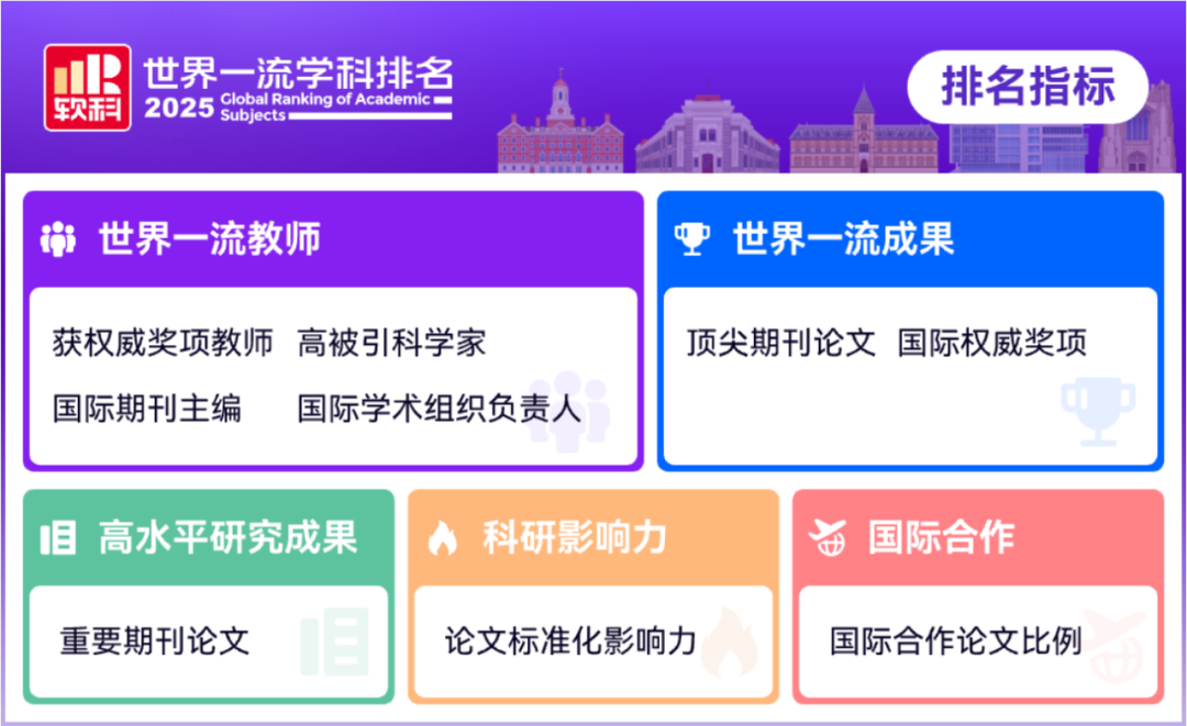 世界一流学科排名基于“世界一流教师”、“世界一流成果”、“高水平研究成果”、“科研影响力”、“国际合作”等多项客观指标。