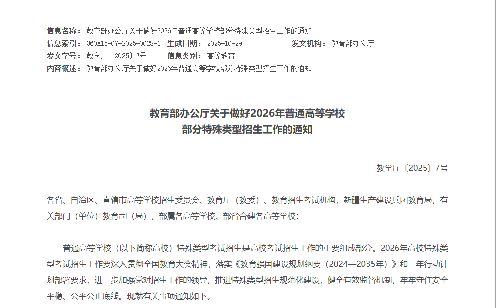 2025 年 10 月底,教育部发布《关于做好 2026 年普通高等学校部分特殊类型招生工作的通知》,首次系统性规范综合评价招生,新高考改革由此迈入 “全面发展导向” 的全新阶段。