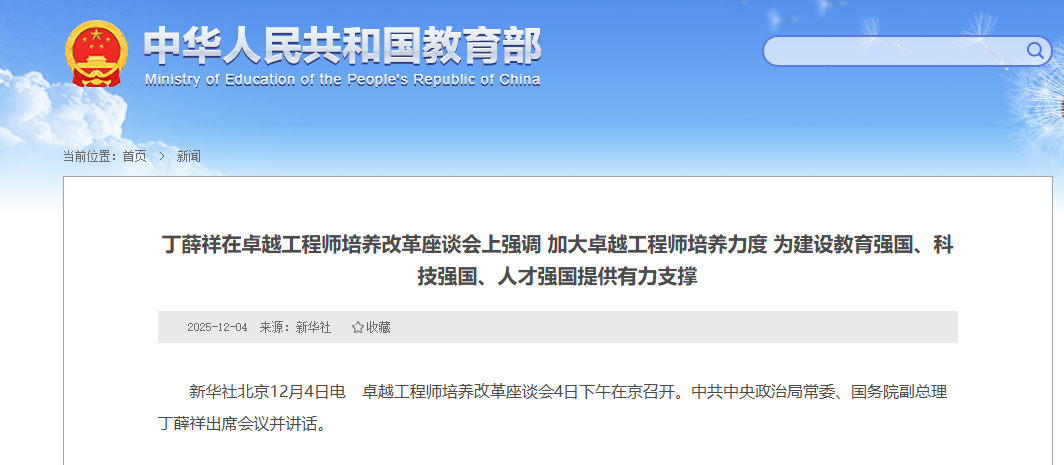 2025年12月以来,国家层面围绕卓越工程师培养的部署明显加速。12月4日,卓越工程师培养改革座谈会在北京召开,国务院副总理丁薛祥出席并强调 “要加快构建中国特色、世界水平的卓越工程师培养体系”。