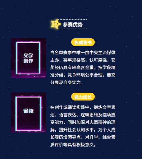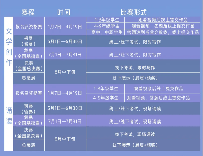 ·文学创作和诵读投稿方式不同,请注意!每位选手可选择其中一个赛项,也可同时参加两个赛项。但每个赛项下每个分类限提交1篇(个)作品。