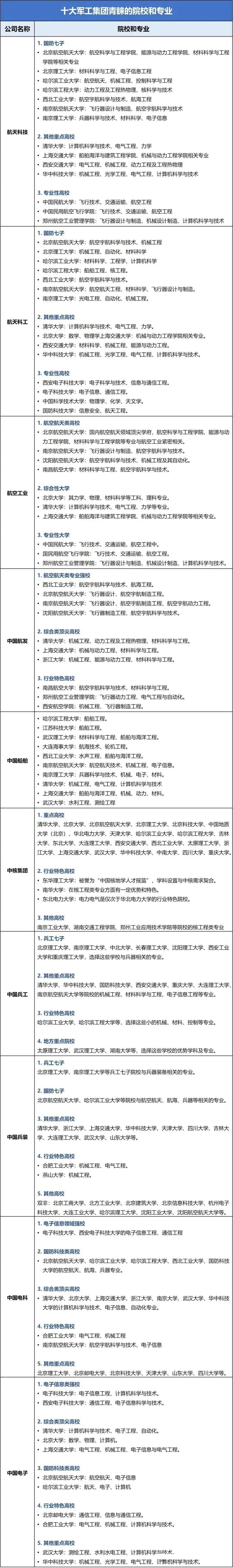 兵器类、航空航天类、电气类、机械类、材料类等工科强校。例如:国防七子、兵工七子以及部分985/211院校。此外,企业涉及领域不同,校招时面向的大学也所有不同。