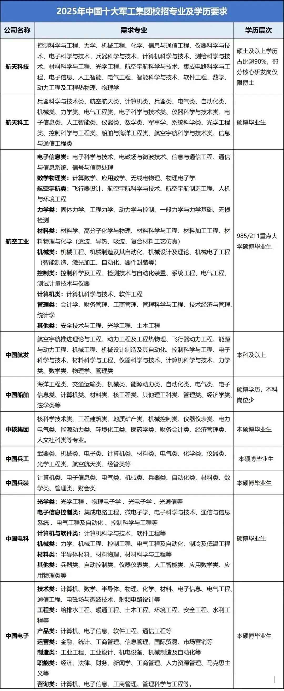 以下为2025年中国十大军工集团校招专业以及学历要求: