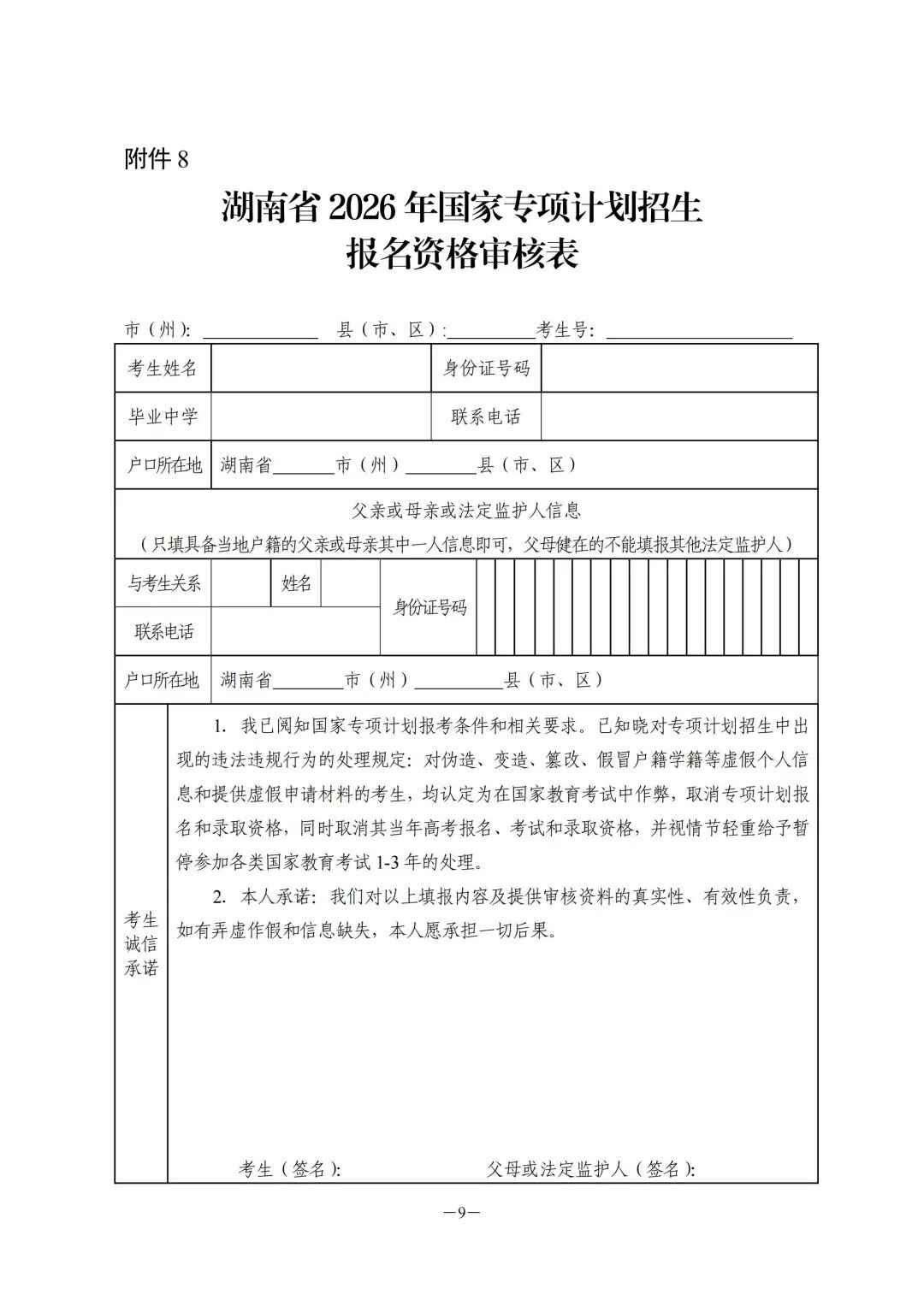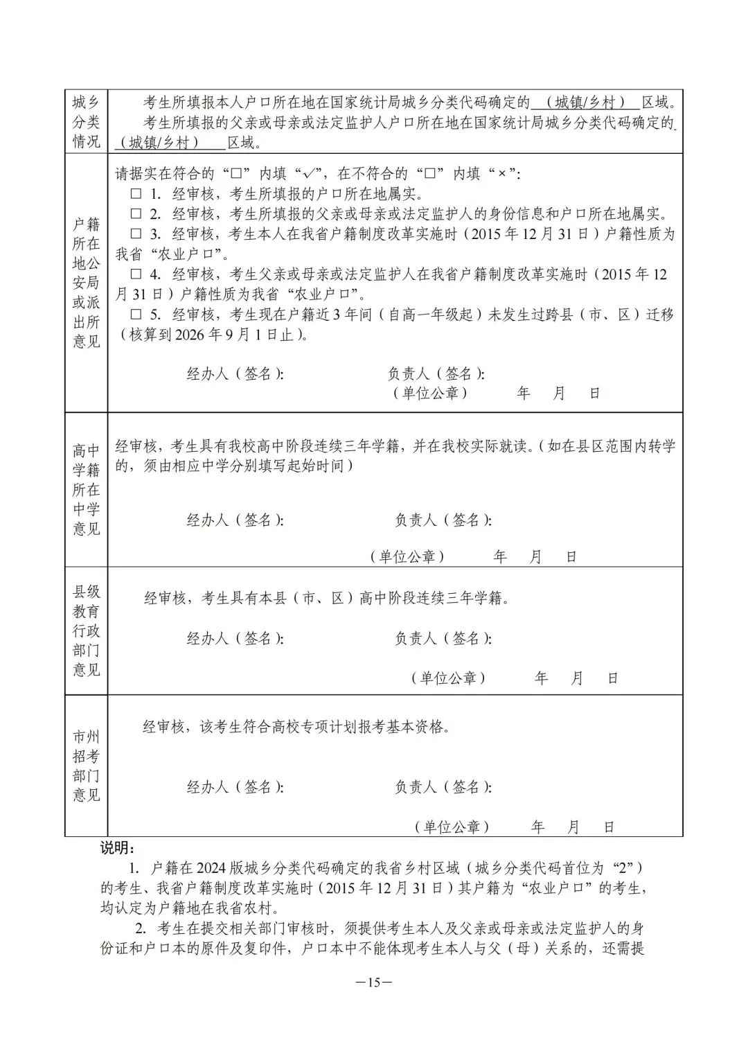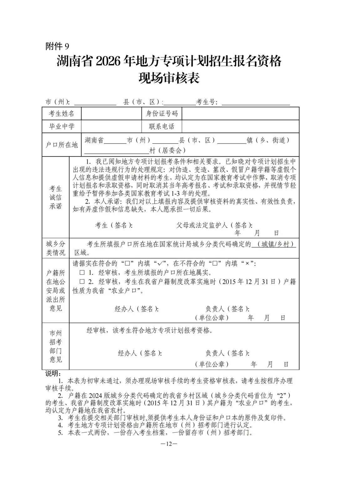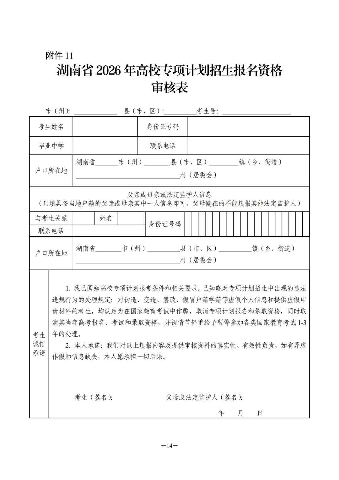 (三)高校专项计划。按照相关规定,我省实施高校专项计划的区域为茶陵县等51 个县(市、区)(见附件14)。报考学生须同时具备以下基本条件:(1)符合我省2026年统一高考报名条件并已参加当年高考报名;(2)考生本人及其父亲或母亲或法定监护人户籍在我省实施区域且城乡分类代码确定为乡村区域(2024版统计用区划代码和城乡划分代码中城乡分类代码首位为“2”),或在我省户籍制度改革实施时(2015年12月31日)户籍为我省实施区域的农业户口,其中考生本人须具有当地连续3年以上户籍;(3)考生本人具有户籍所在县(市、区)高中连续3年学籍并实际就读。在此基础上,有关高校可提出其他报考要求并在招生简章中明确。