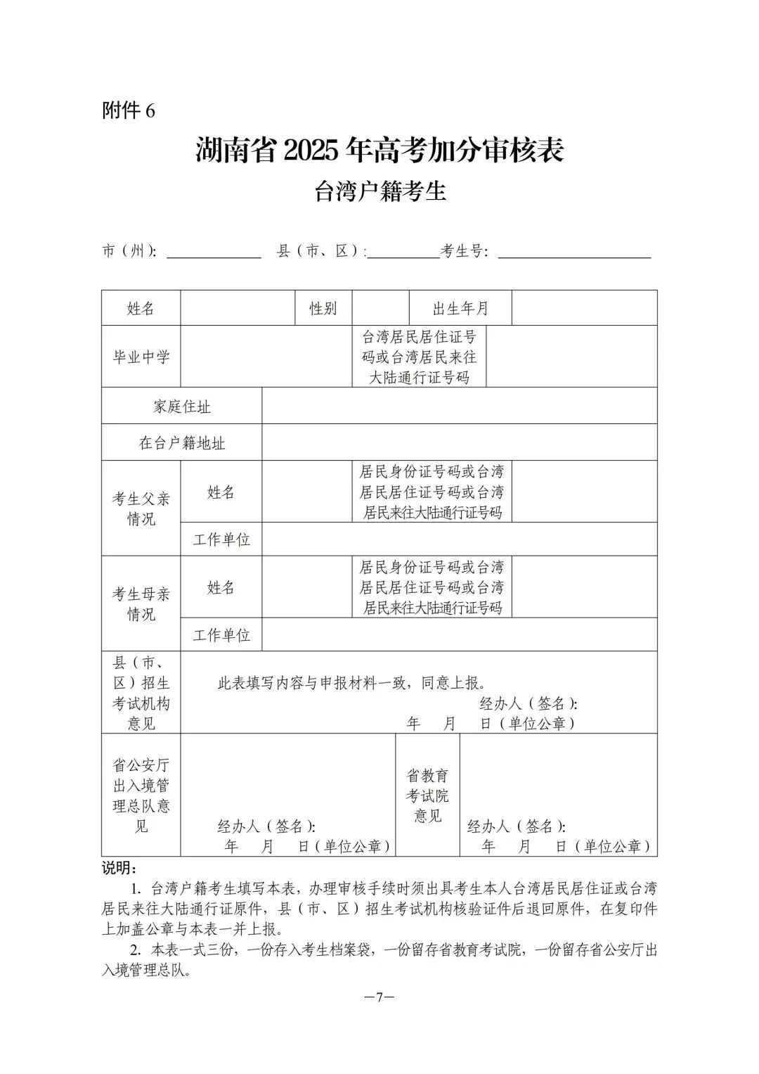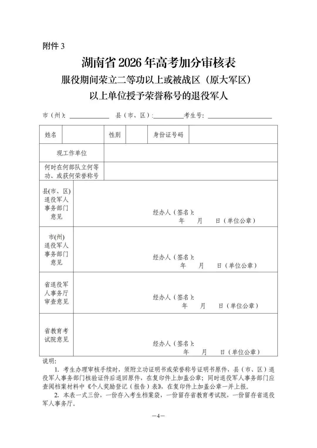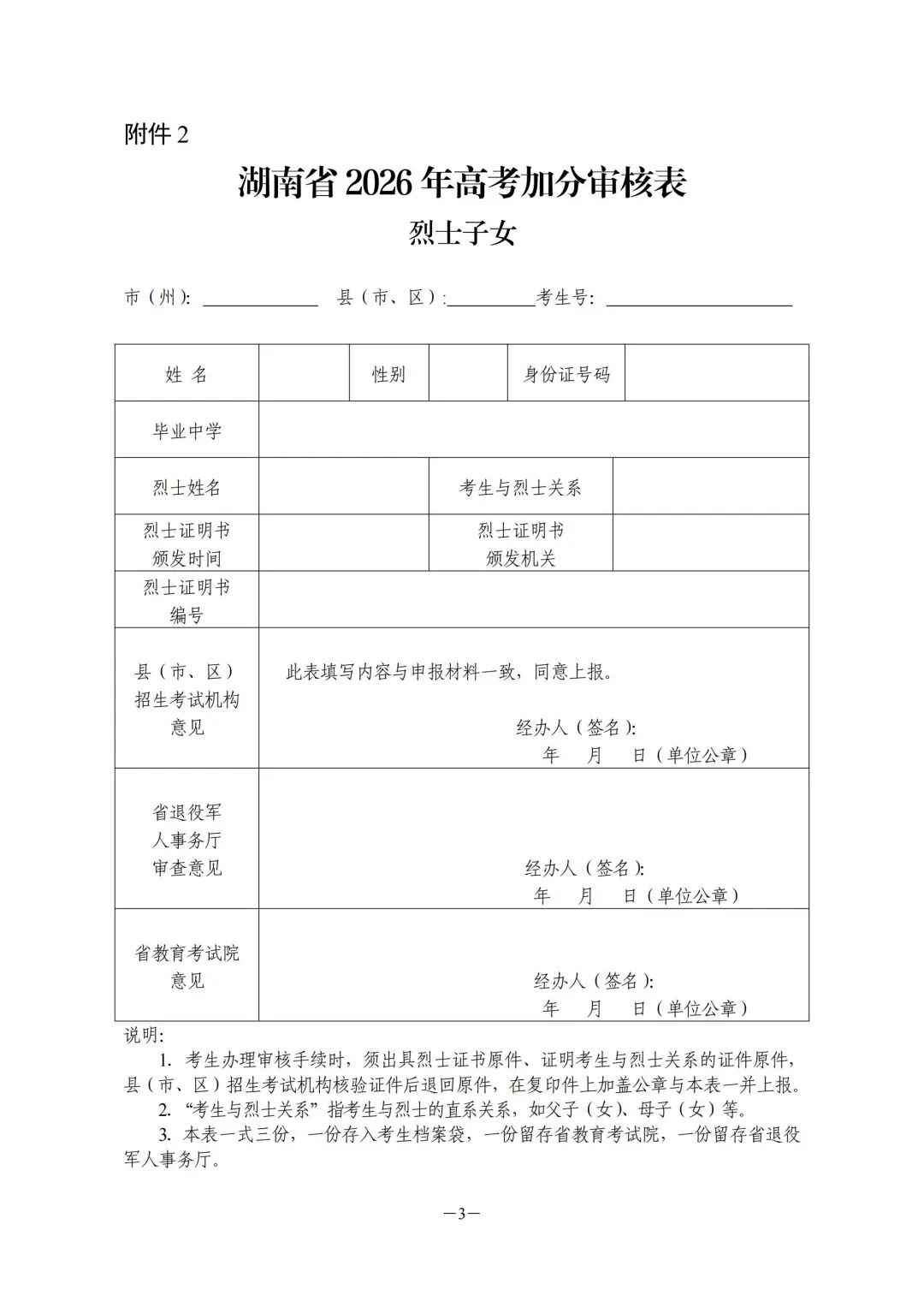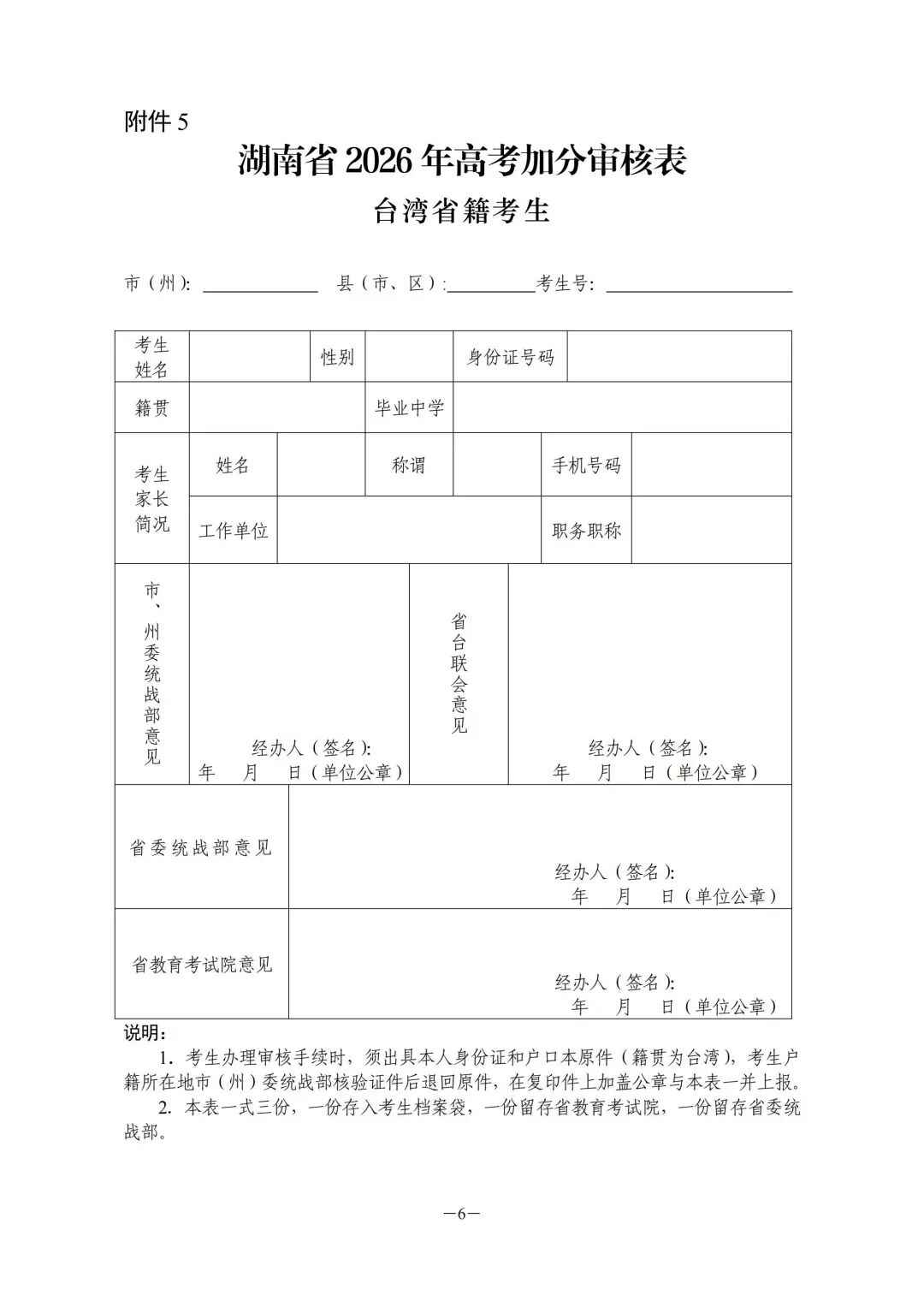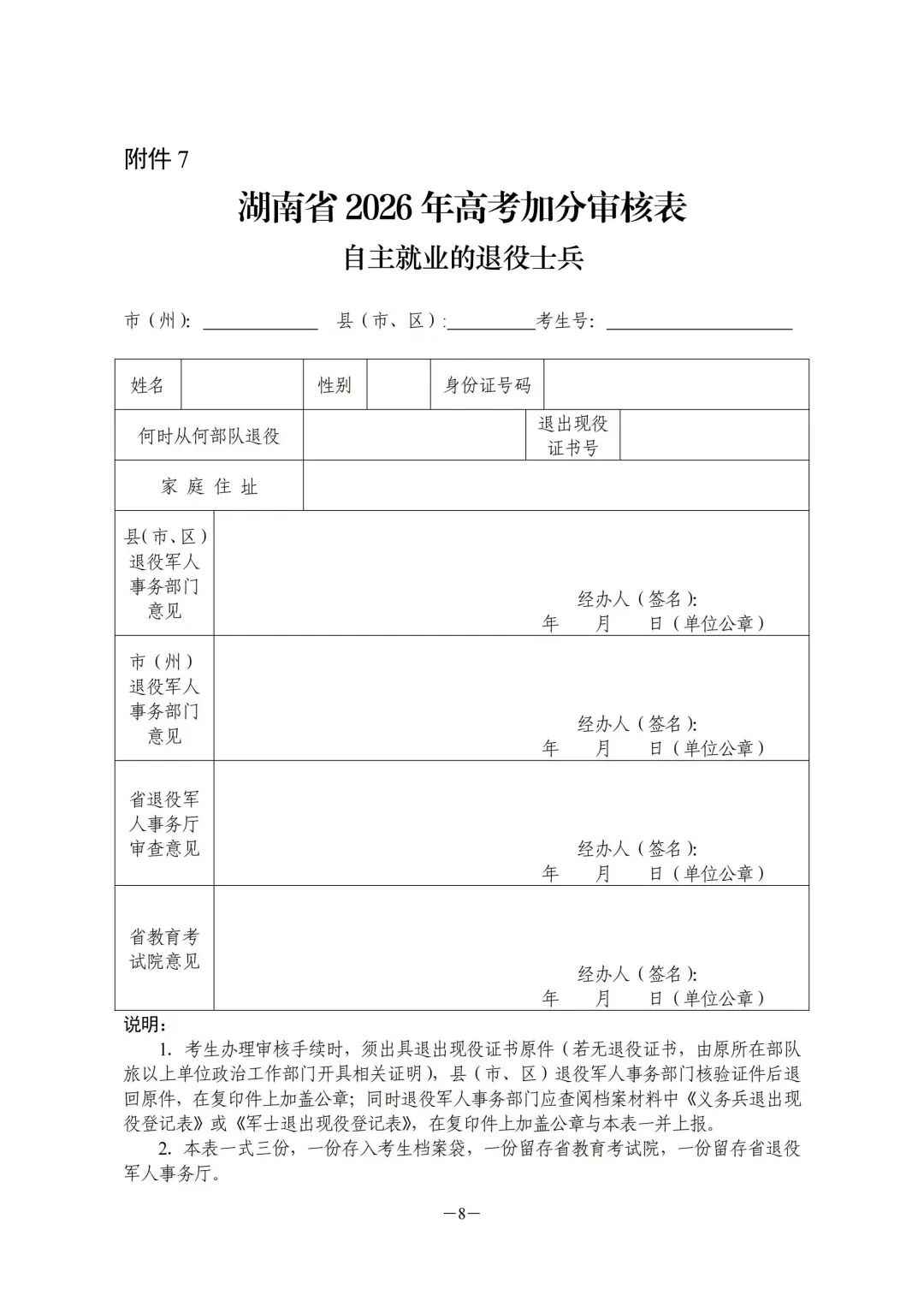 (1)2026年2月7日起(2月27日后申报的,3月7日起),高级中等教育学校(报名点)可打印下列表格:烈士子女高考加分审核表;服役期间荣立二等功以上或被战区(原大军区)以上单位授予荣誉称号的退役军人高考加分审核表;归侨、归侨子女、华侨子女高考加分审核表;台湾省籍考生高考加分审核表;台湾户籍考生高考加分审核表;自主就业的退役士兵高考加分审核表;国家专项计划招生报名资格审核表;高校专项计划招生报名资格审核表。