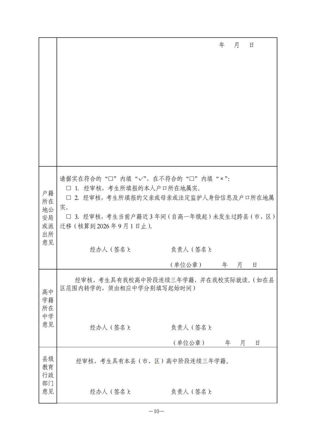 4.上交资格审核表。2026年3月26日前,考生将县(市、区)、市(州)相关部门审核完成的各类审核表交至高级中等教育学校(报名点),由高级中等教育学校(报名点)逐级上报至省教育考试院。